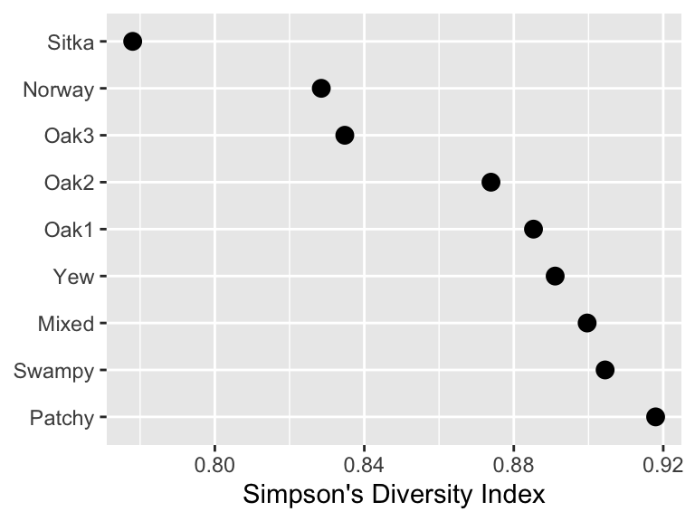 Looking at this we see that the Sitka and Norway habitat are lowest in diversity – poor spruce and pine. The Mixed, Swampy, and Patchy habitats are the highest. But we don’t know from looking at this if the differences are substantial. We’d like to have a measure of variance of the diversity for each of these habitats and then infer if these differences are “meaningful” (for your definition of “meaningful”) or even “significant” (shudder).