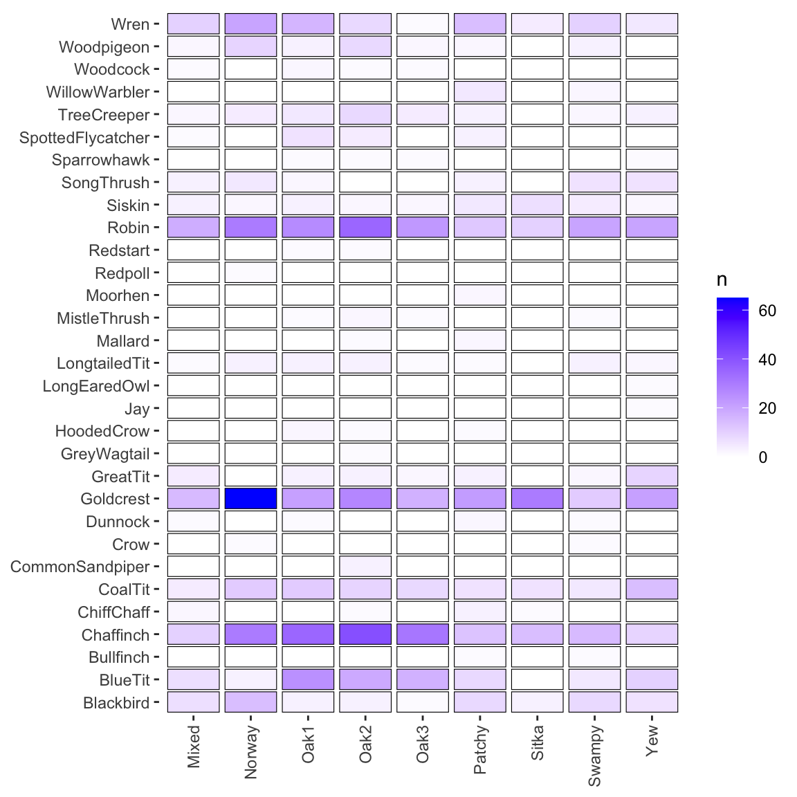 Here is a quick visualization of bird diversity by habitat.