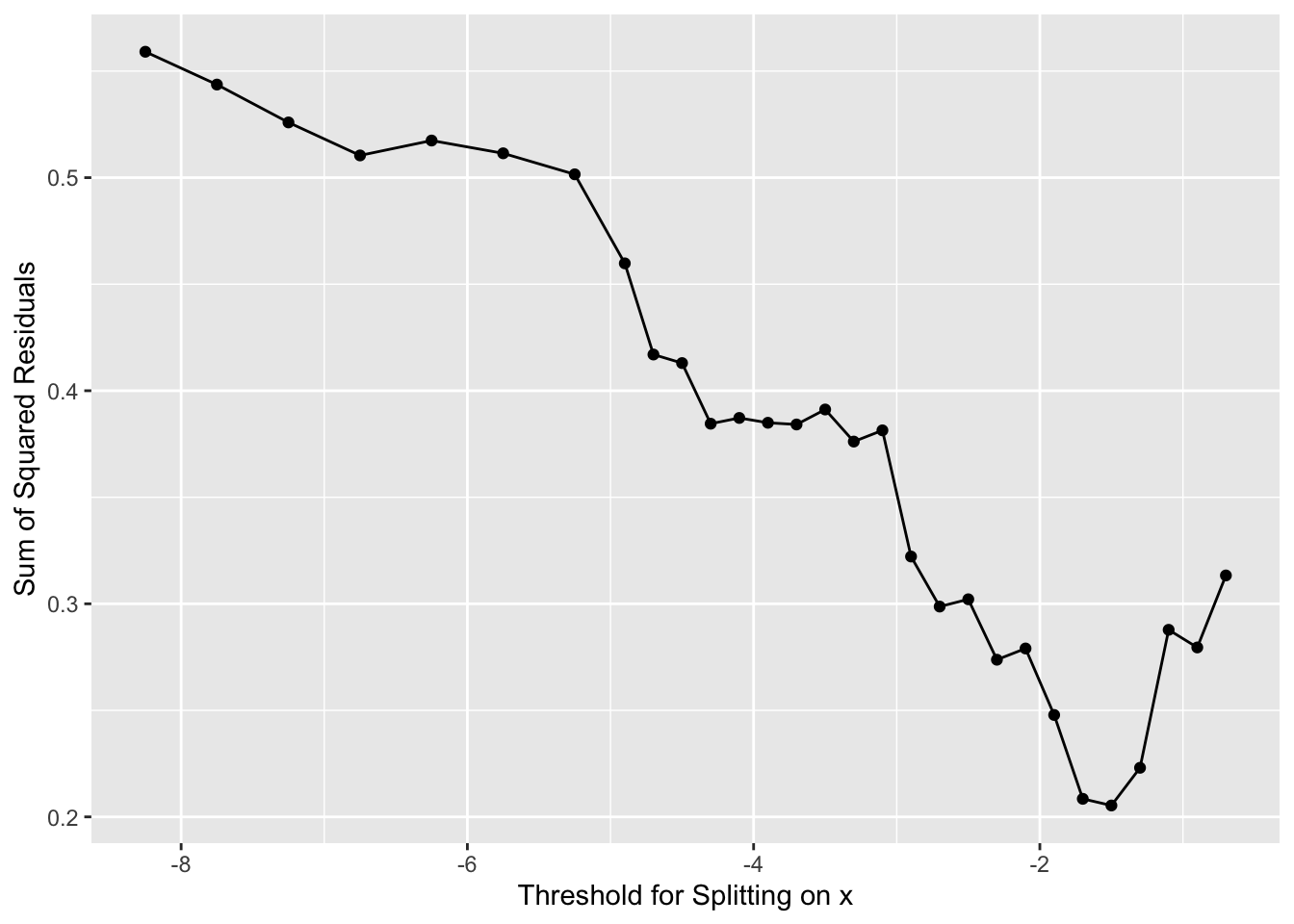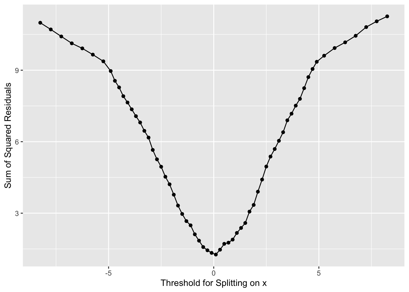 And where should we split? We pick the value of \(x\) at the minimum value of the residuals.