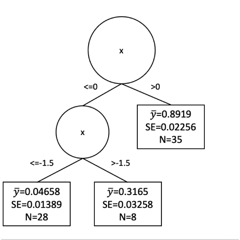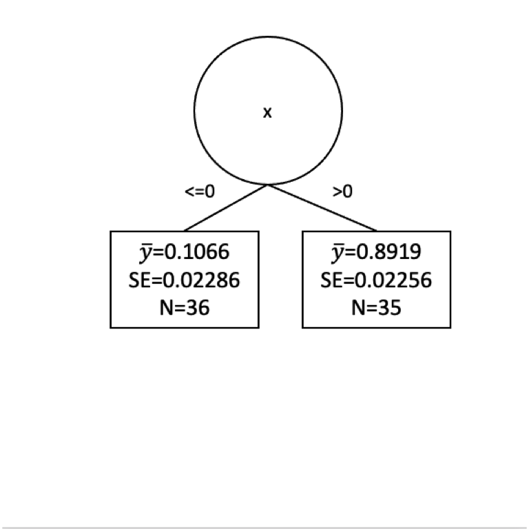 Well we have a prediction for \(y\) now in two leaves. Where \(x \leq 0\) we get \(\hat y= 0.107\) and where \(x > 0\) we get \(\hat y= 0.892\). But these are far from perfect. Indeed the standard error on these is pretty big. Here are the standard errors and the sample sizes.