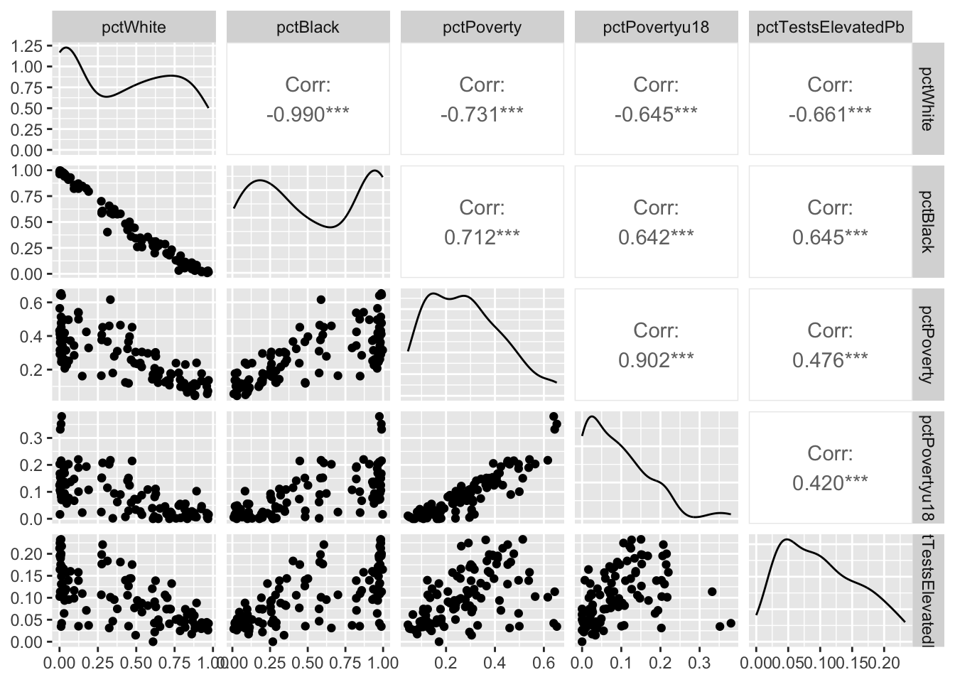 For each census tract in these data, we have the percentage of the population that identifies as white or Black in the American Community Survey data. The data also shows the percent of the population that is in poverty and the percentage of the population that is under the age of 18 and in poverty (kids in poverty). With these data, there is also a variable named pctTestsElevatedPb. This is the percentage of tests performed that showed elevated lead in the blood of children. The Reuters article will tell you more about it. So a number like 0.12 means that 12% of the tests showed elevated lead. The data were collected over 2010-2015. Most of these tracts have about 1000 tests that goes into the pctTestsElevatedPb column. I fear the data are robust.