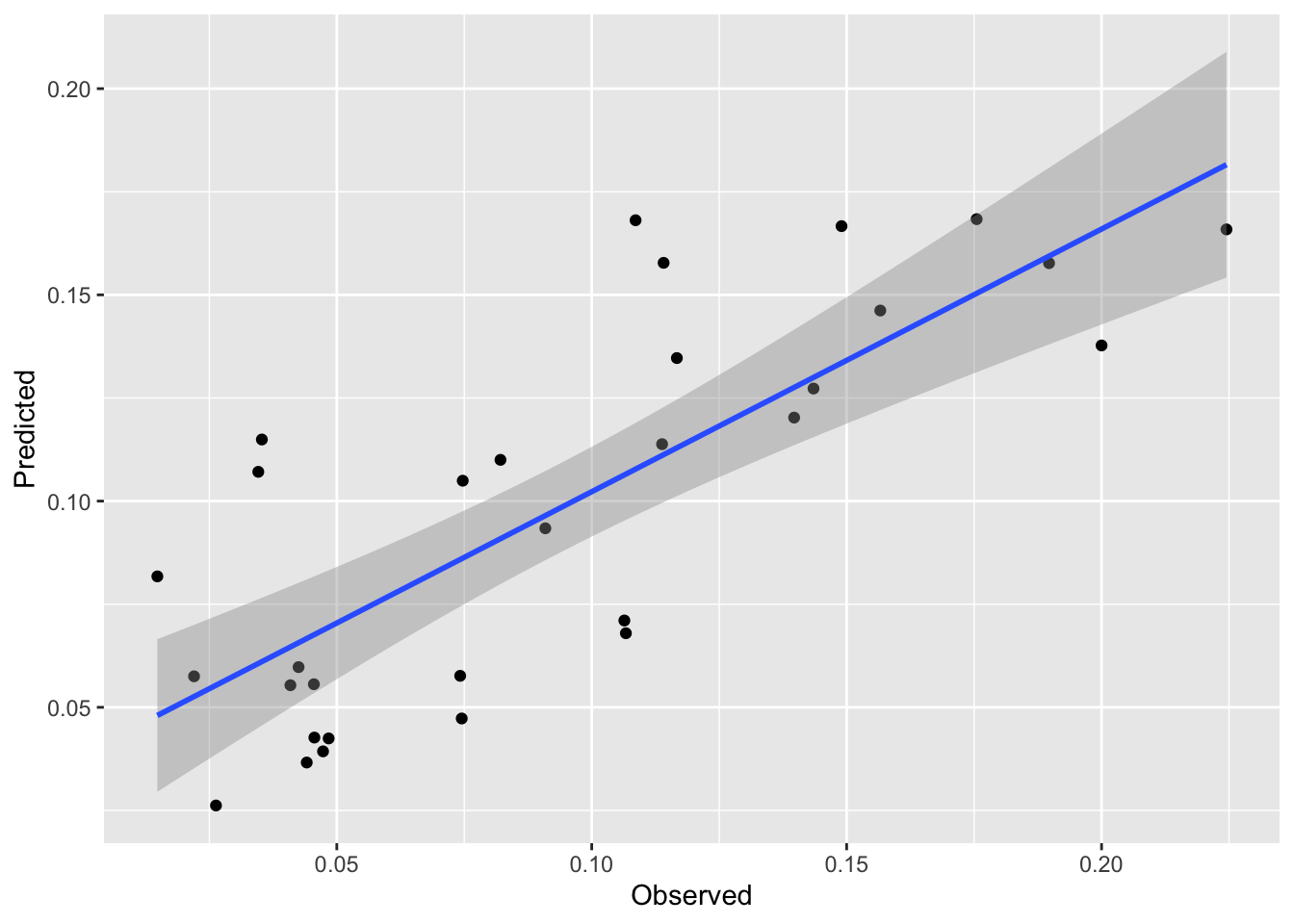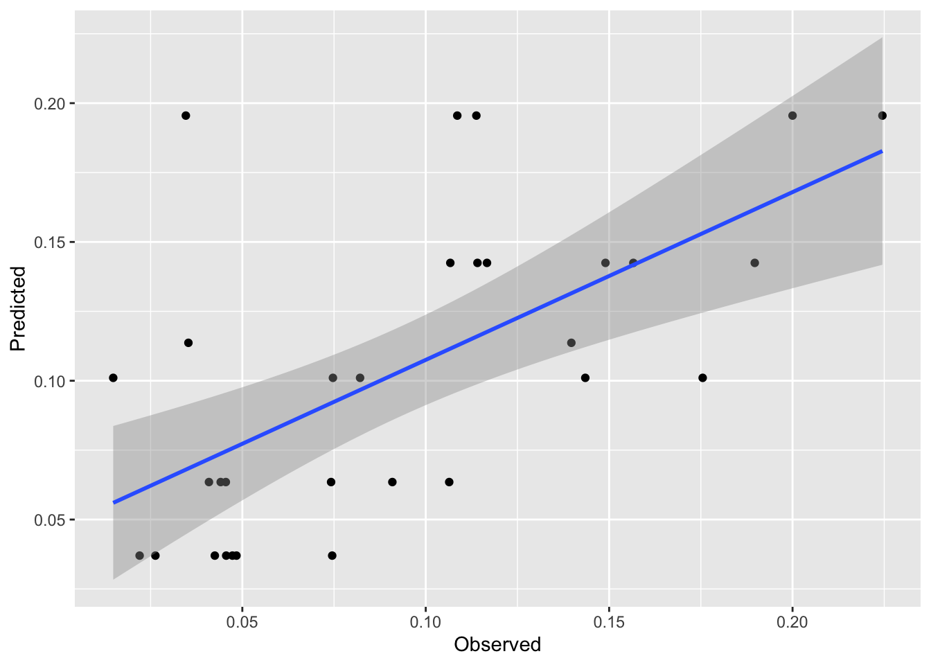 Now, these data are bound to be noisy. Let’s look at the skill of the rpart model using the testing data and plot the observed vs predicted data.