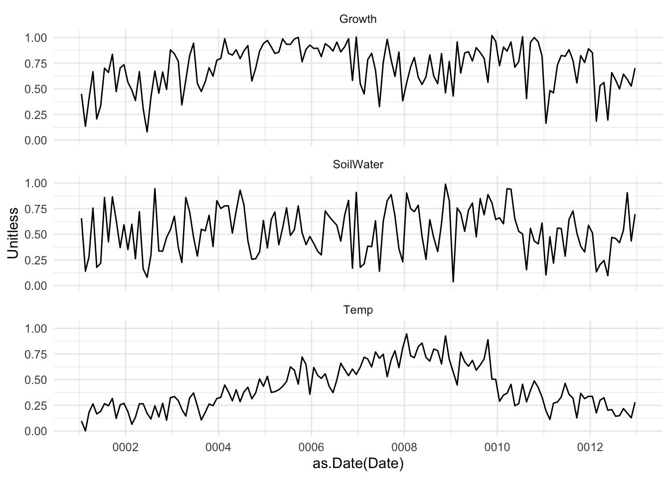 I have some data on tree growth in the tropics. The data are daily over the course of a year. The file GrowthTempWater.csv has four columns. The first is the date, the second is cambial growth, the third is average daily temperature and the fourth is total plant available water in soil. The last three are all unitless and range from zero to one. Lower numbers mean less growth, lower temperature, less available water. Conversely, higher numbers mean faster growth, higher temps, and more soil water. Having these be relative numbers will keep you from getting hung up on units (e.g., grams of carbon per day, degrees C, or cubic cm of water).
