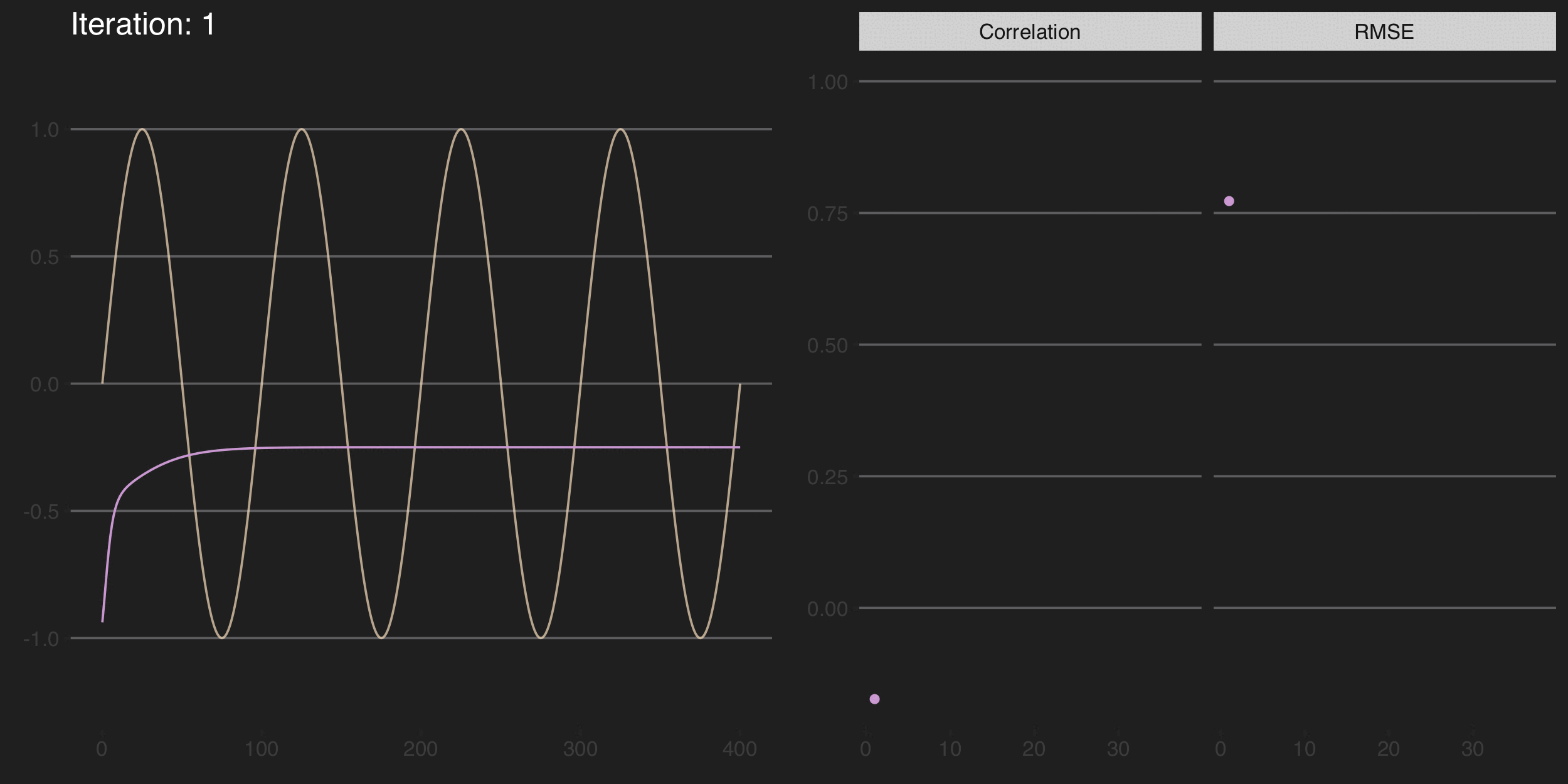 Here is a quick demo of how a neural network successively iterates to improve fit. We will create a simple sine wave and then ask a neural net to try to predict it. We will animate that process by saving the prediction at each iteration.