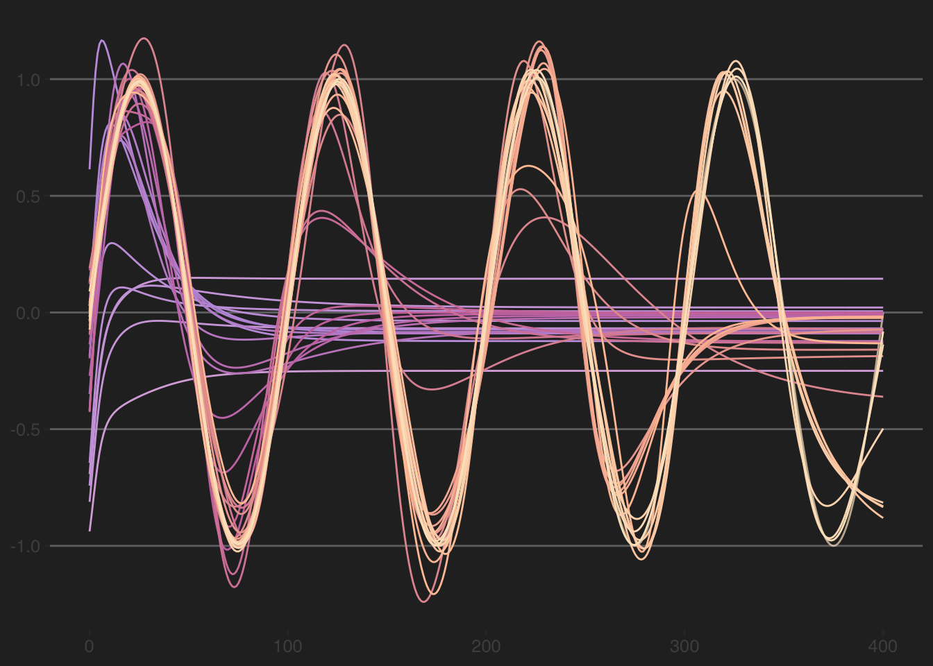 We will use a single-hidden-layer neural network to fit to the data. We do some cumbersome looping in order to save the predictions from each iteration. If the fit is really really good (r > 0.999) the loop will quit. With this simple sine function, that criteria is usually met.