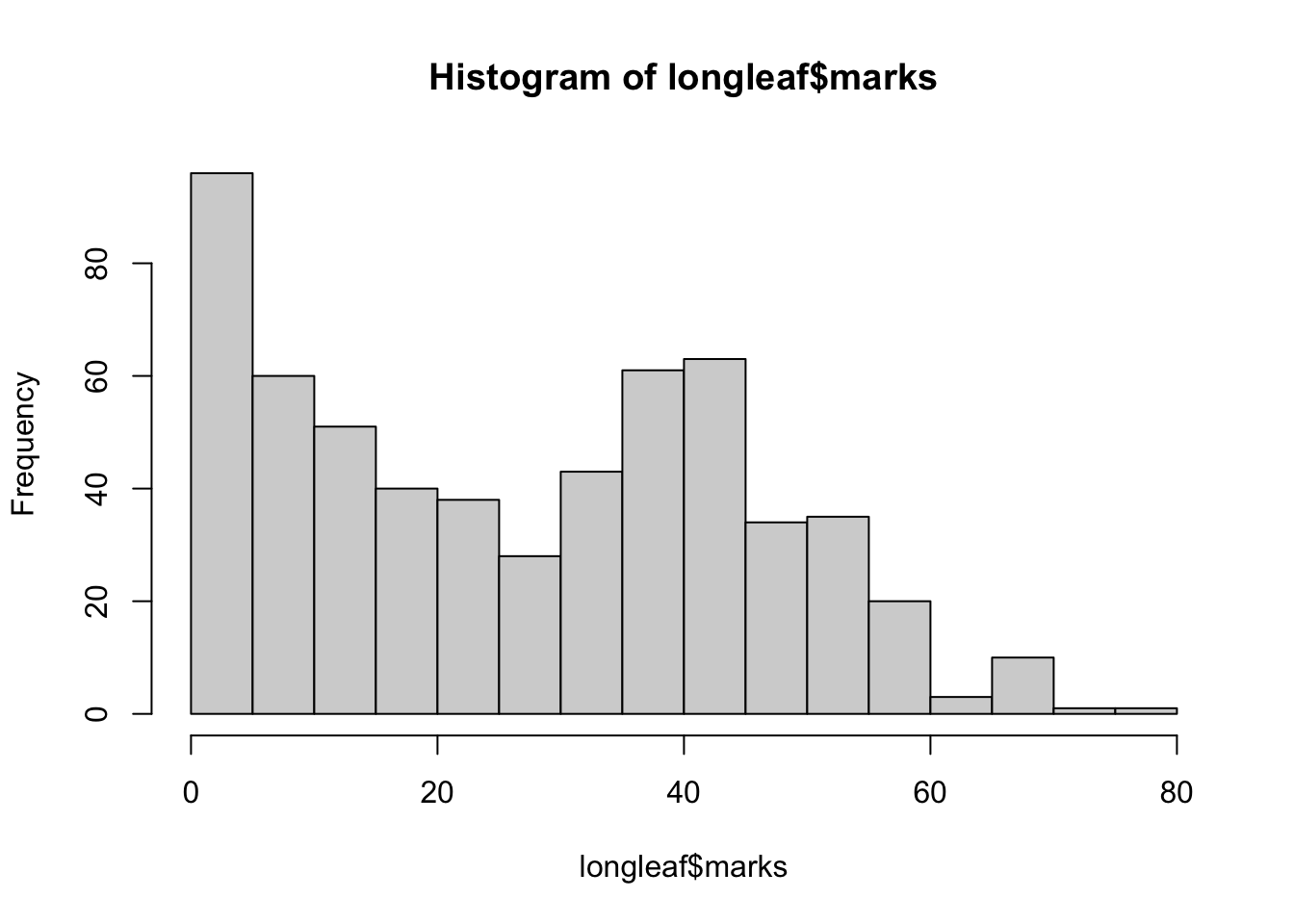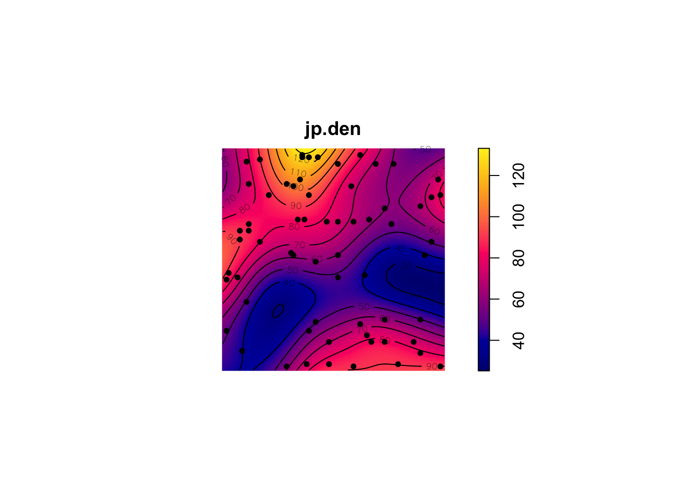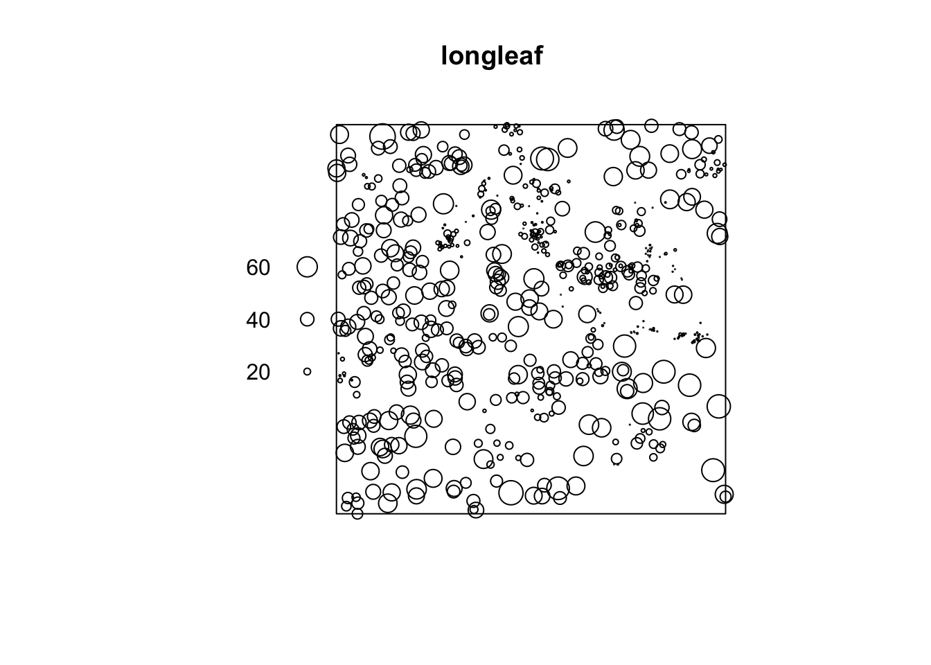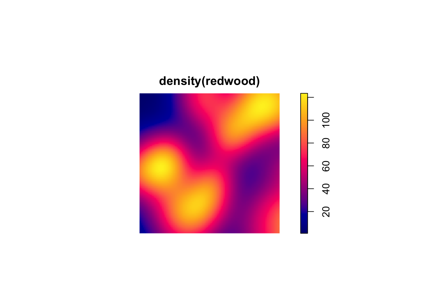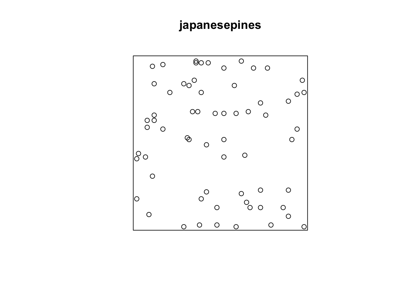 Note also that I’m using the plot function to show the point data. E.g., plot(japanesepines). Because japanesepines is class ppp, the generic function plot.ppp is being used with the authors of spatstat having made the visualization choices for you. If you are a die hard ggplot enthusiast you can figure out how to make your own plot using ggplot. E.g., you can get the units right and geek out on this as much as you like by looking at the plumbing of the japanesepines object which is a list. I’m not suggesting you do this. But I know many of you take your data viz seriously and might be offended by the default plots.