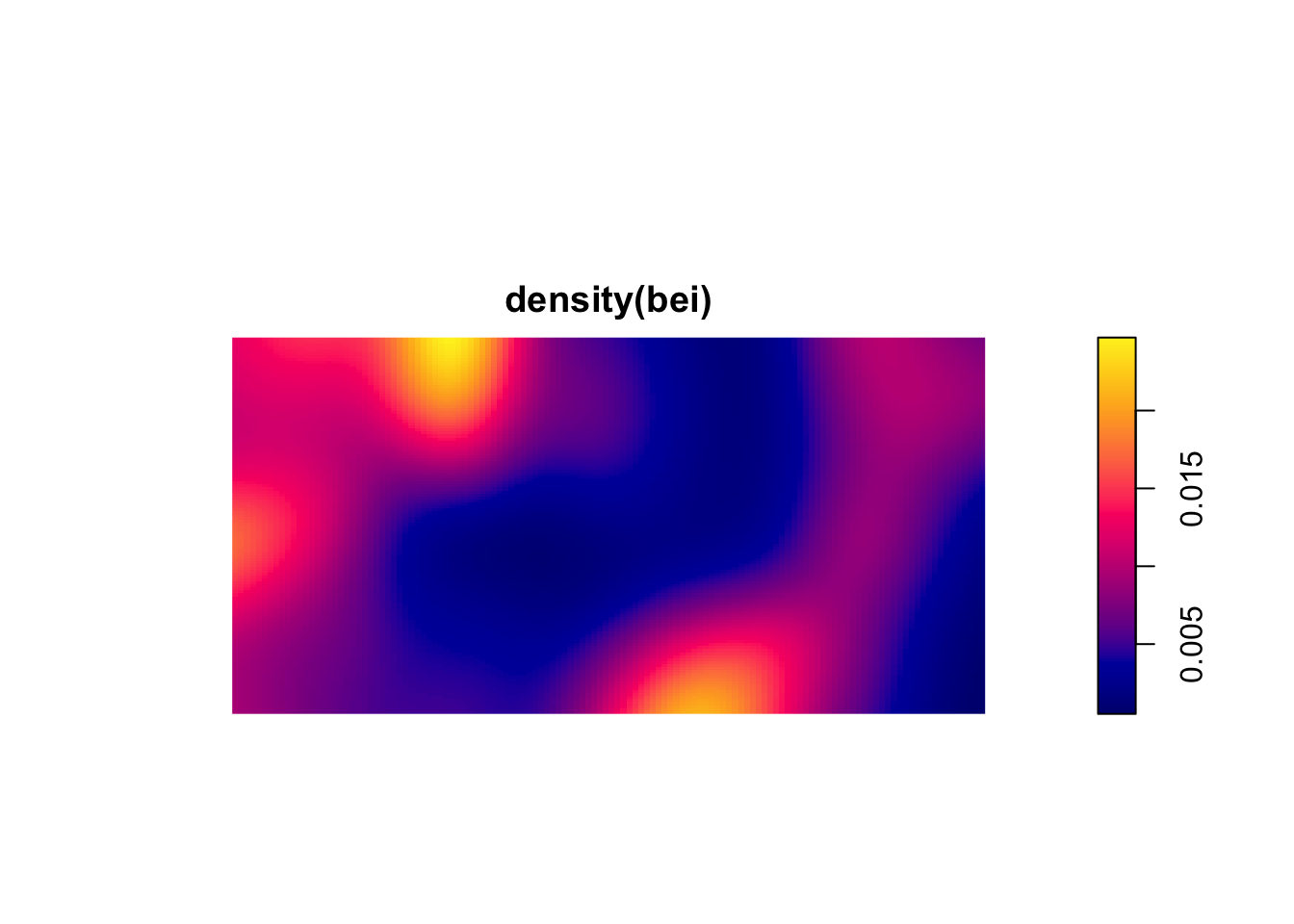 These are plots of the intensity of the points. They show the expected density and thus the units are points per unit area. If the plot surface has peaks it means that intensity is a function of spatial location. This is a non-parametric estimate and the function above density.ppp selects the bandwidth of the kernel for you. If you want to look at different bandwidths change the argument sigma. For instance try values of 0.1, 1, 10 like so plot(density(bei,sigma=10)).