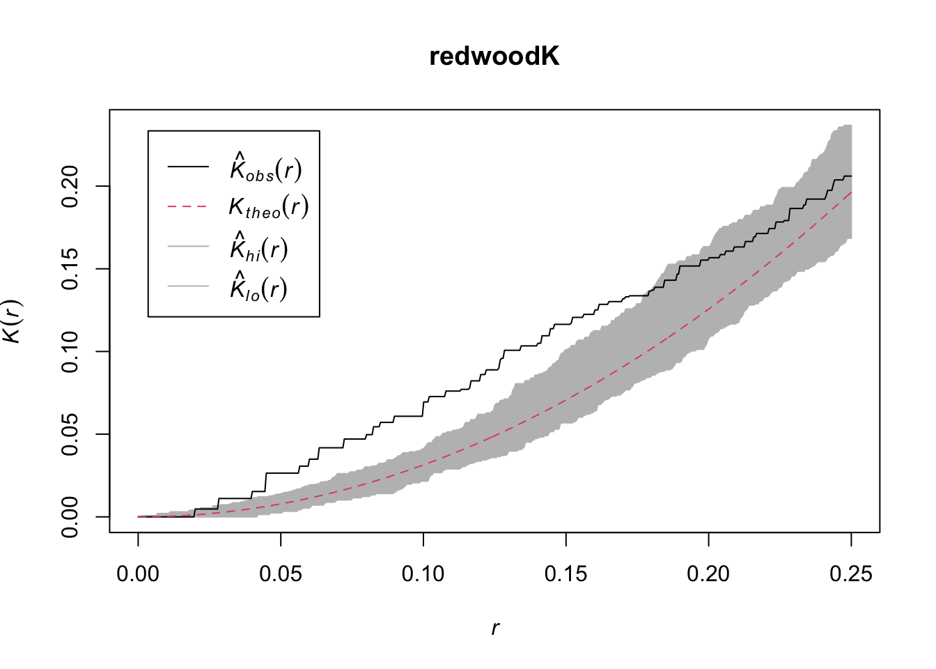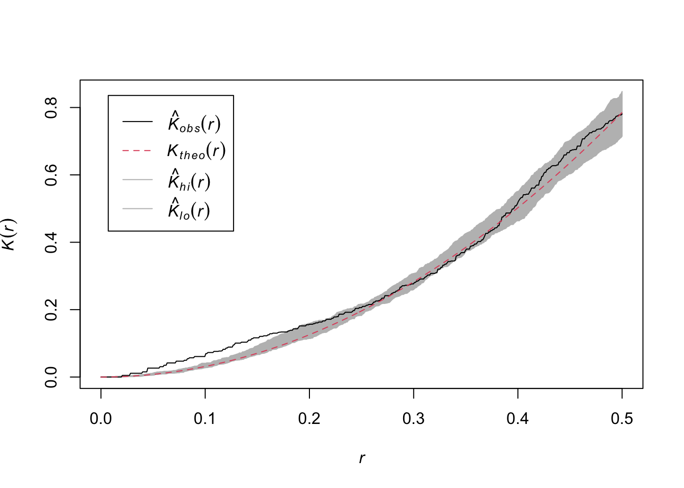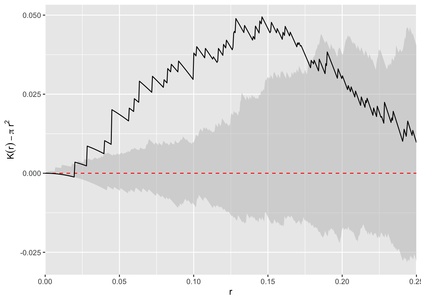 We can test \(\hat{K}\) against CSR which has a value of \(K(r)=\pi r^2\) for a homogeneous Poisson process. Furthermore, we can calculate an envelope of possible values of \(K(r)\) in a Monte Carlo framework where the number of simulations specifies the significance level as \(\alpha = 2/(1 + n)\) where \(n\) is the number of simulations. If the observed function value lies outside the envelope we can reject the null hypothesis of CSR at the distance \(r\).