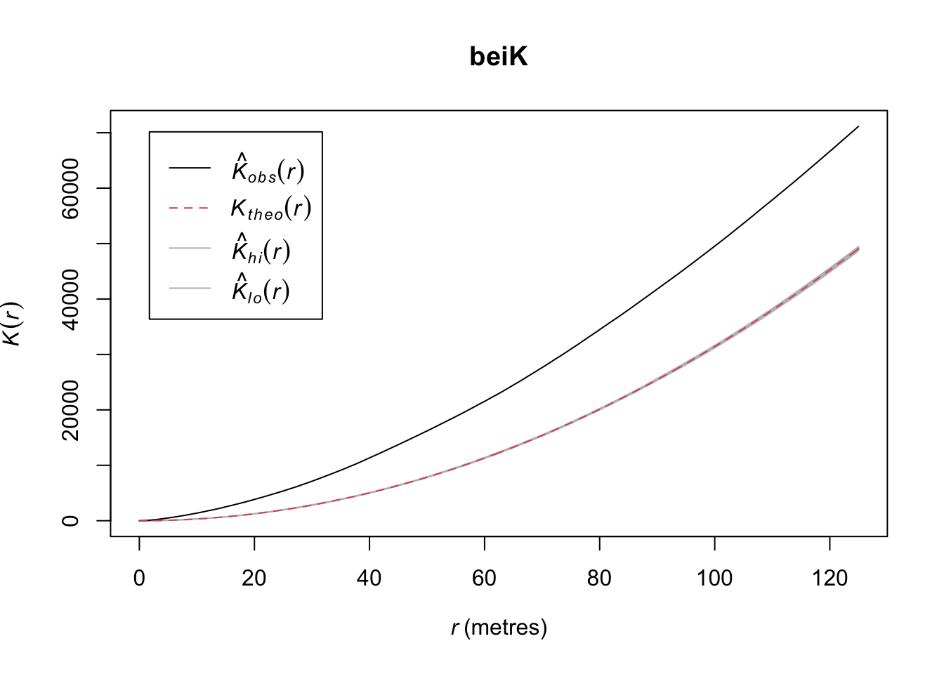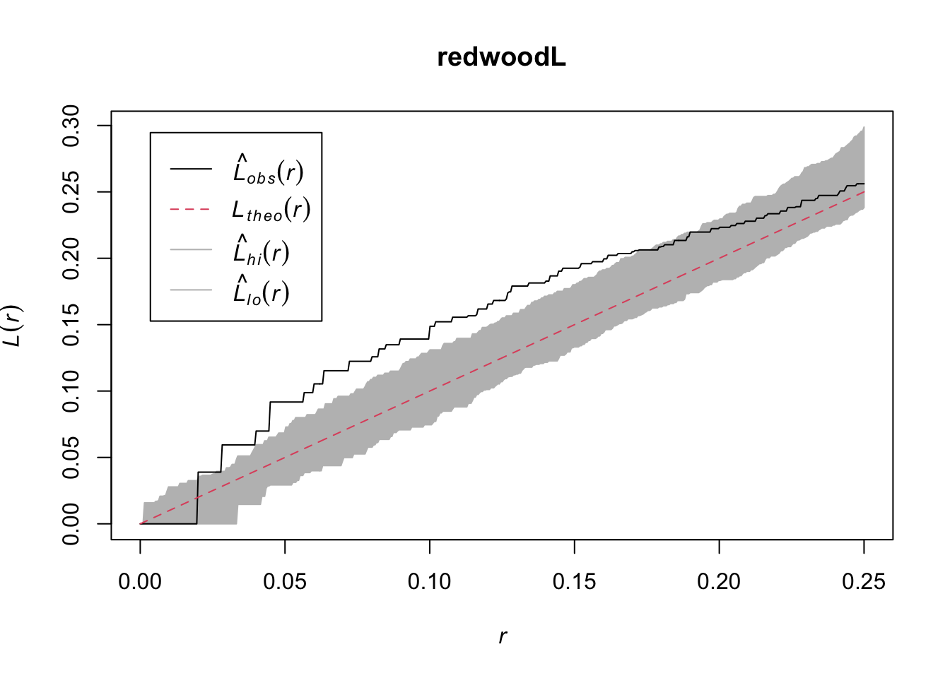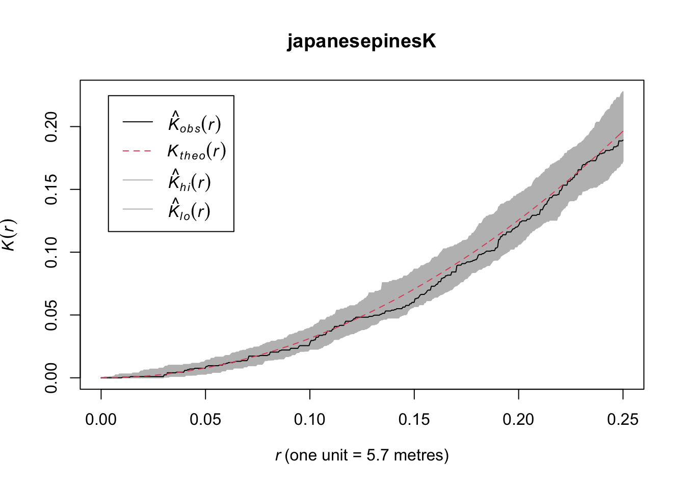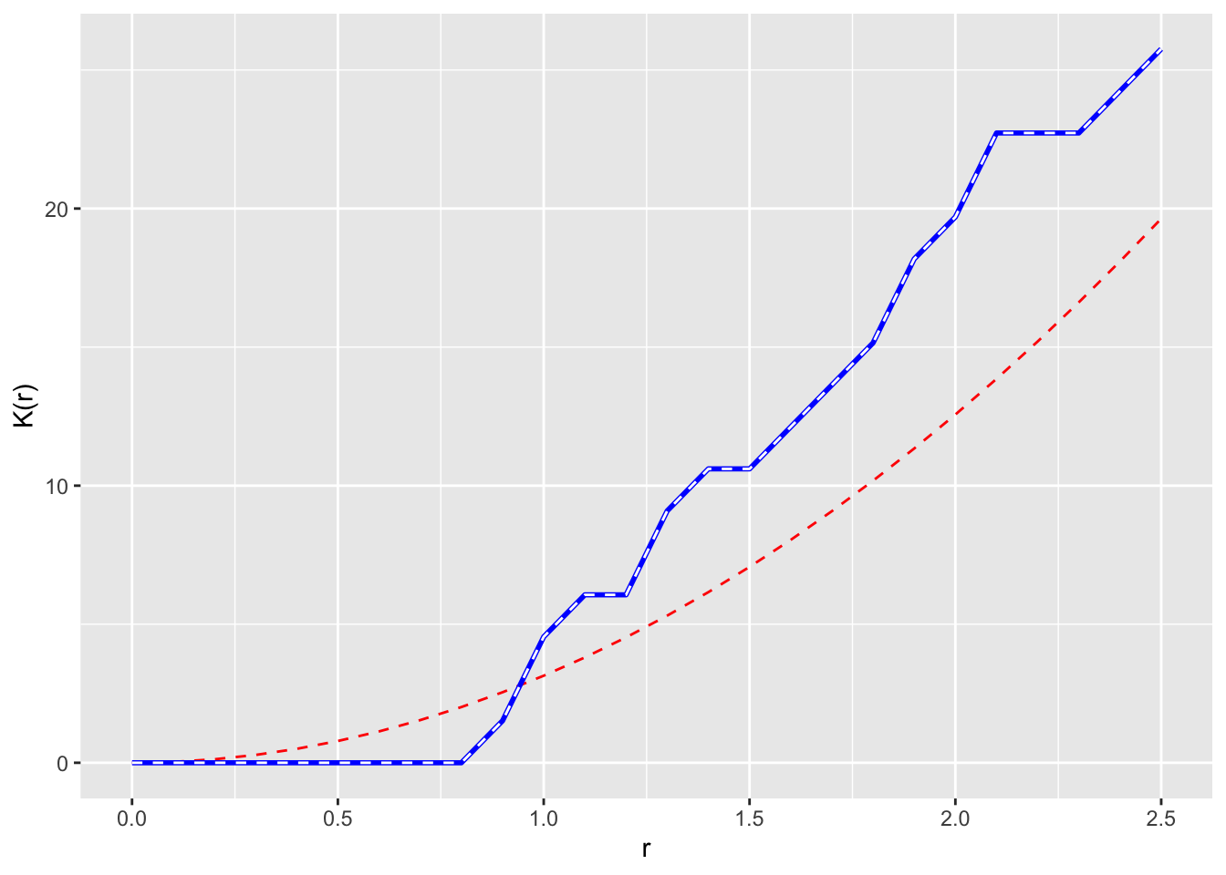 We can test \(\hat{K}\) against CSR which has a value of \(K(r)=\pi r^2\) for a homogeneous Poisson process. Furthermore, we can calculate an envelope of possible values of \(K(r)\) in a Monte Carlo framework where the number of simulations specifies the significance level as \(\alpha = 2/(1 + n)\) where \(n\) is the number of simulations. If the observed function value lies outside the envelope we can reject the null hypothesis of CSR at the distance \(r\).