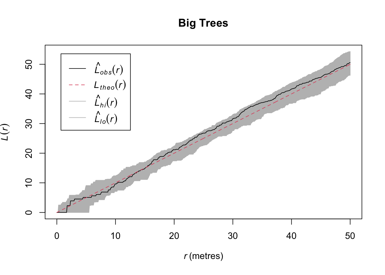 So in contrast to the whole data set, we see that while the entire data set shows clustering, the big trees show CSR. That’s kind of cool. We could start speculating about what ecological processes might drive that pattern.