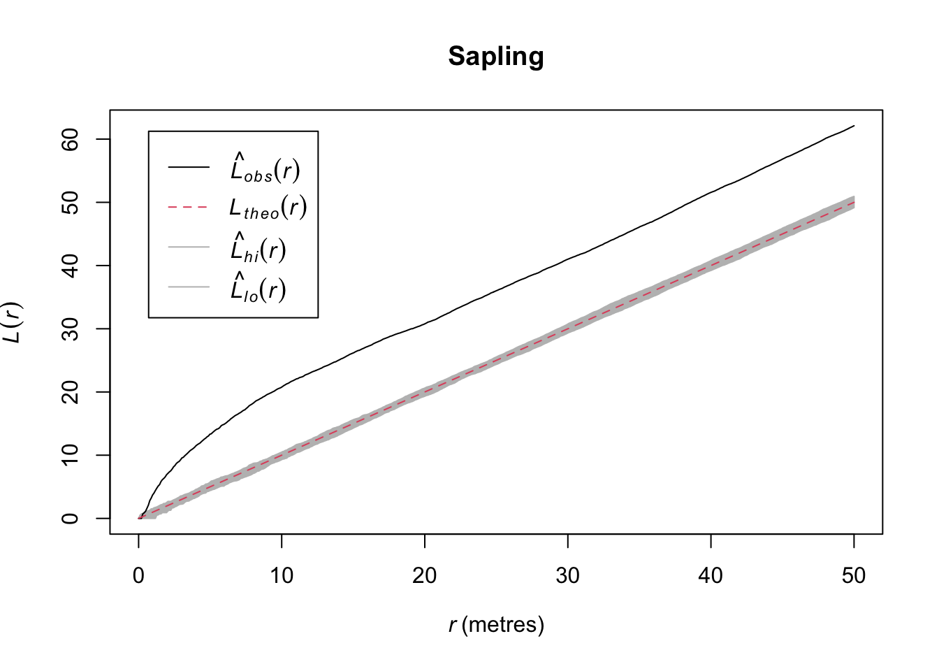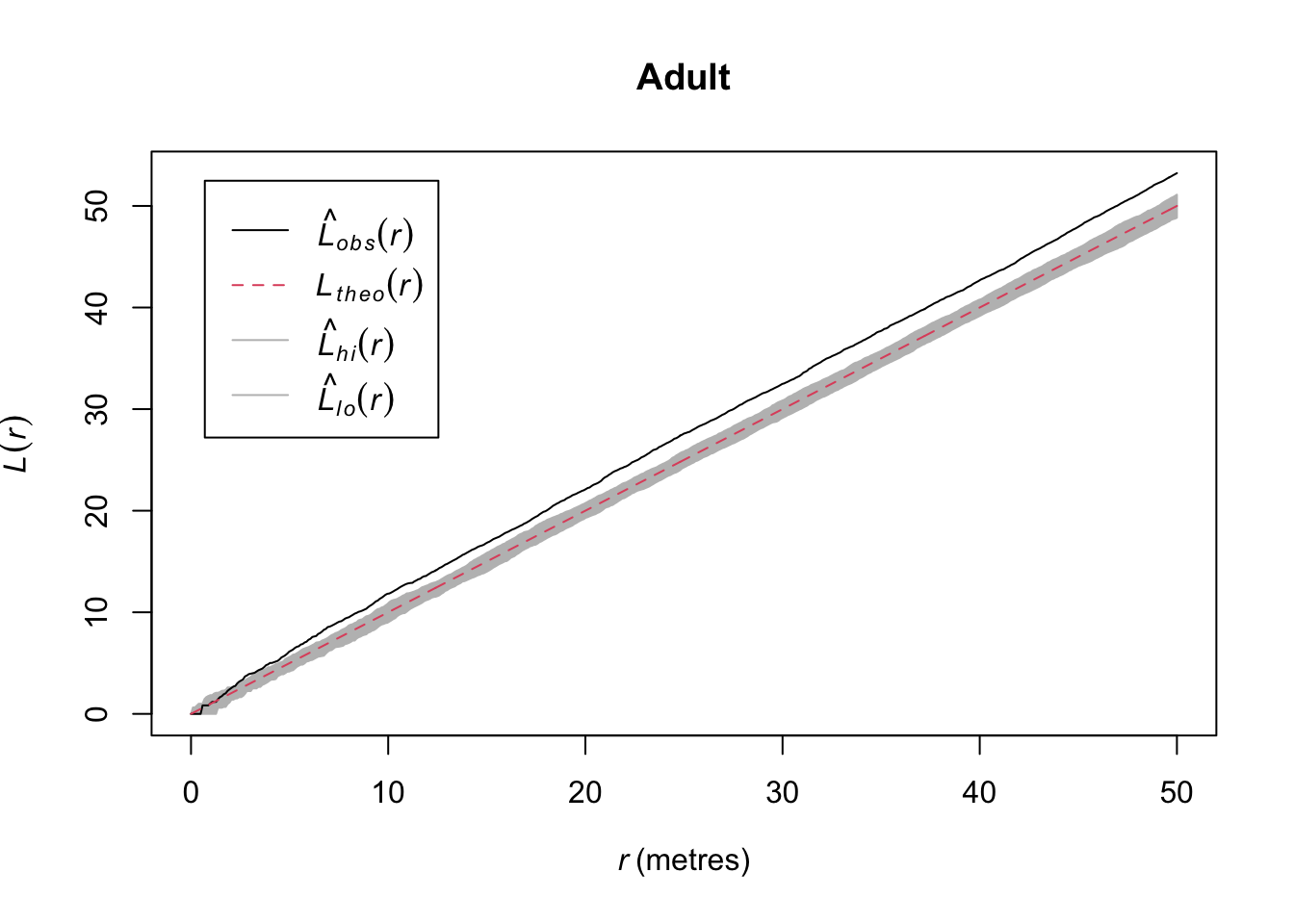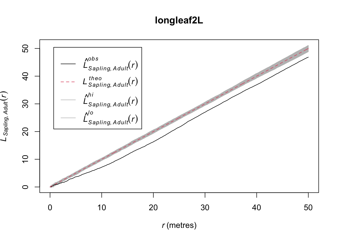 This shows the cross L-function between saplings and adults – the L-function is based on distances from points from one age class to points from the other class. Thus the plot shows the L-function for saplings to adult pairs.This suggests that while there is within class attraction (the clustering seen previously), there is between class repulsion (inhibition). Can you put on your ecologist hat and figure out why this might be happening?