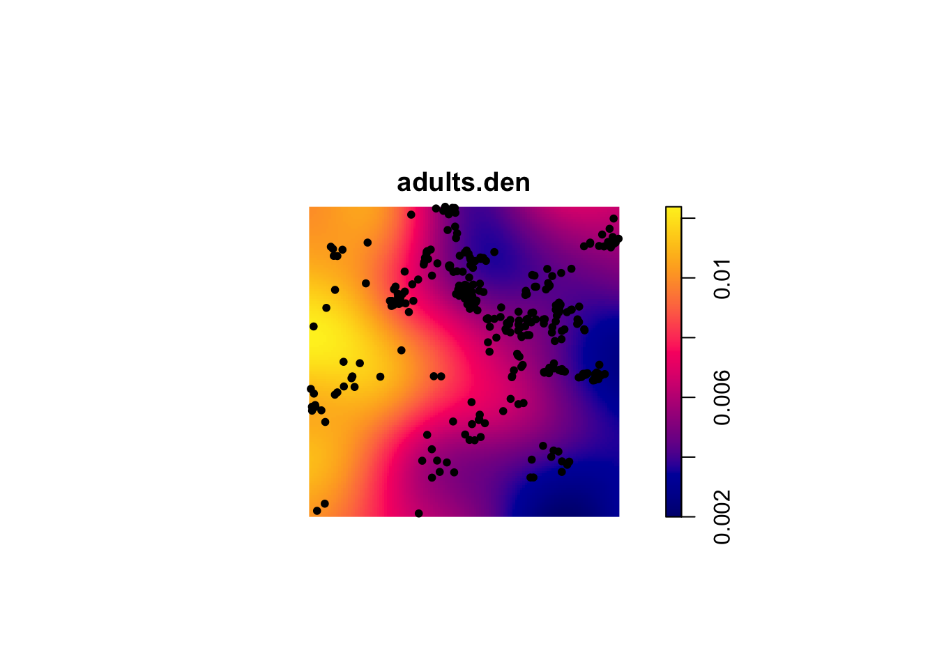 In the plotted L functions above we definitely see that both age classes are clustered and the saplings much more so than the adults. But looking at the map I think we should see how those age classes interact. Because it looks to me like they are in different places. Let’s plot the density map of the adults and put the points where the sapling occur on top.
