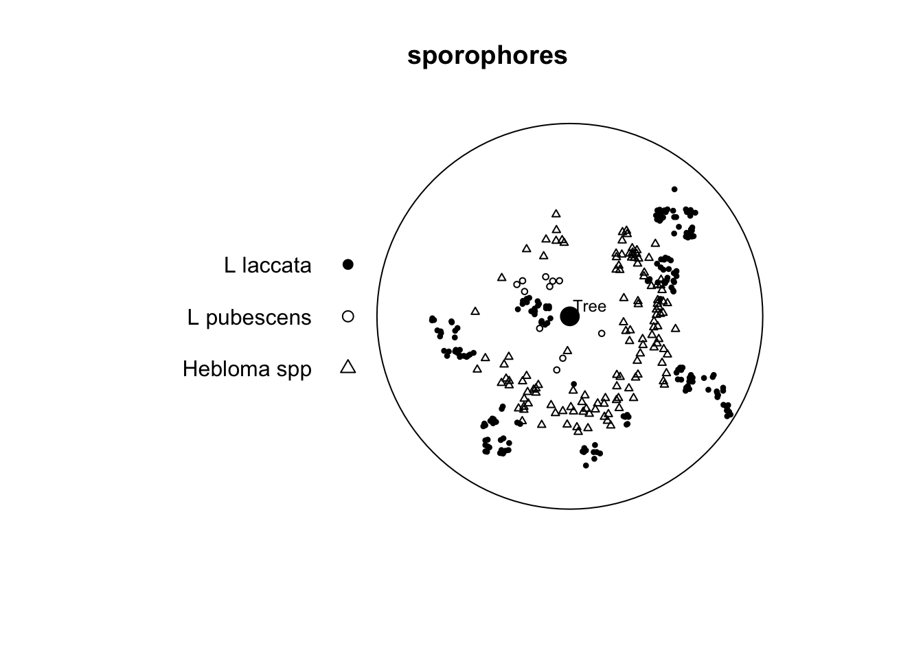 Note that this is a marked point pattern with three species of fungi. The data come from Ford et al. (1980). It’s not important that you understand the ins and outs of the various species described. You can read up on some of them here. But it’s enough to know that different species have different functional roles and also differing abilities to colonize. Oh, and sporophores are mushrooms (but you probably knew that).