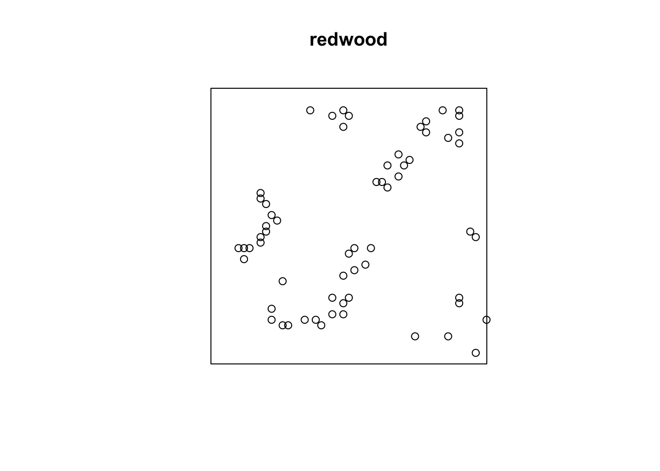 Below we will look at data using the japanesepines, redwood, and bei data sets. You should look at the help file for each, e.g., ?japanesepines, to learn more.