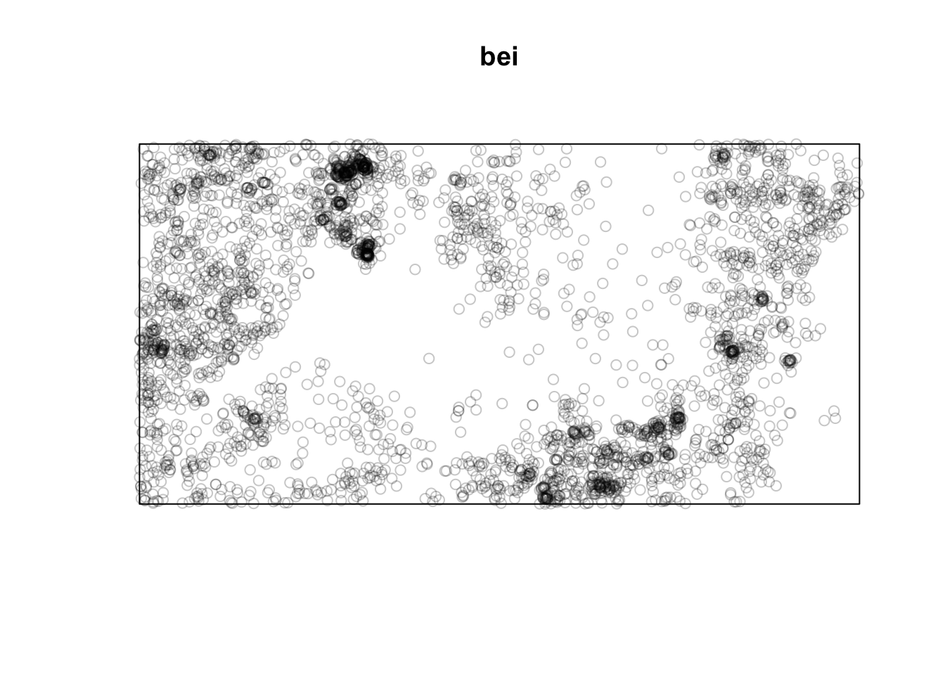 Thus, the japanesepines are randomly distributed while the other two are clumped but in different ways. The redwood data are clumped out to a radius of a fifth of the bounding box while the bei data are clustered out as far as we can measure. Oh, and how far can we measure before running into edge effects?