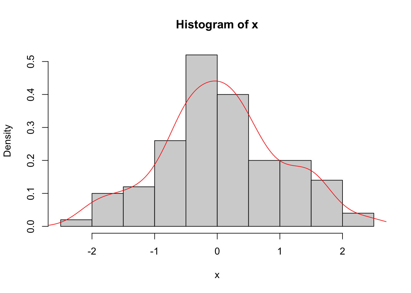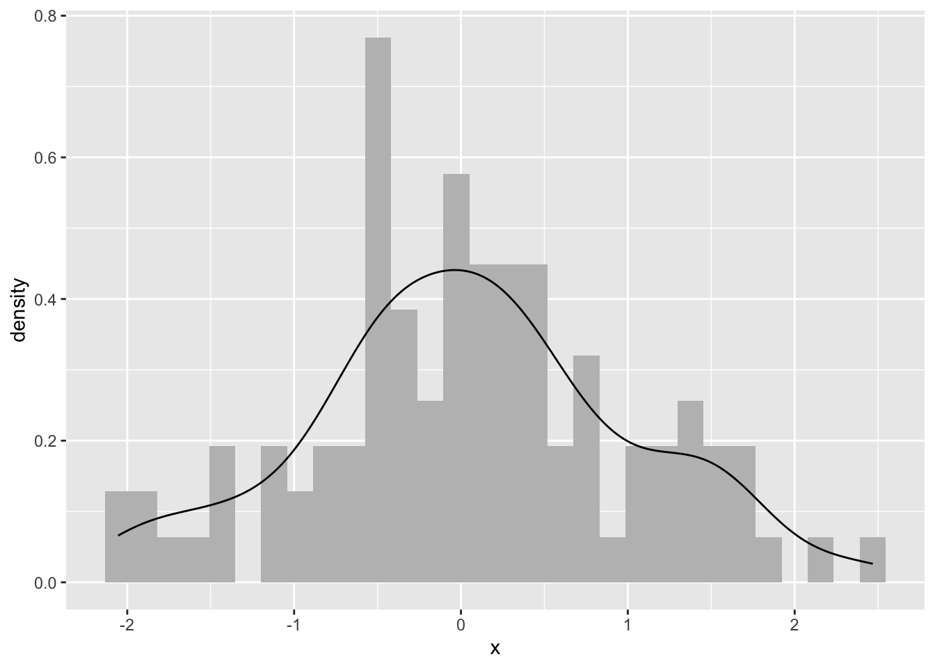 Ok. What is this? We took n random points (n=100from above) and estimated the probability density function with a kernel. Kernel density estimation is a basic data-smoothing technique and the density estimates are closely related to histograms as you can tell.