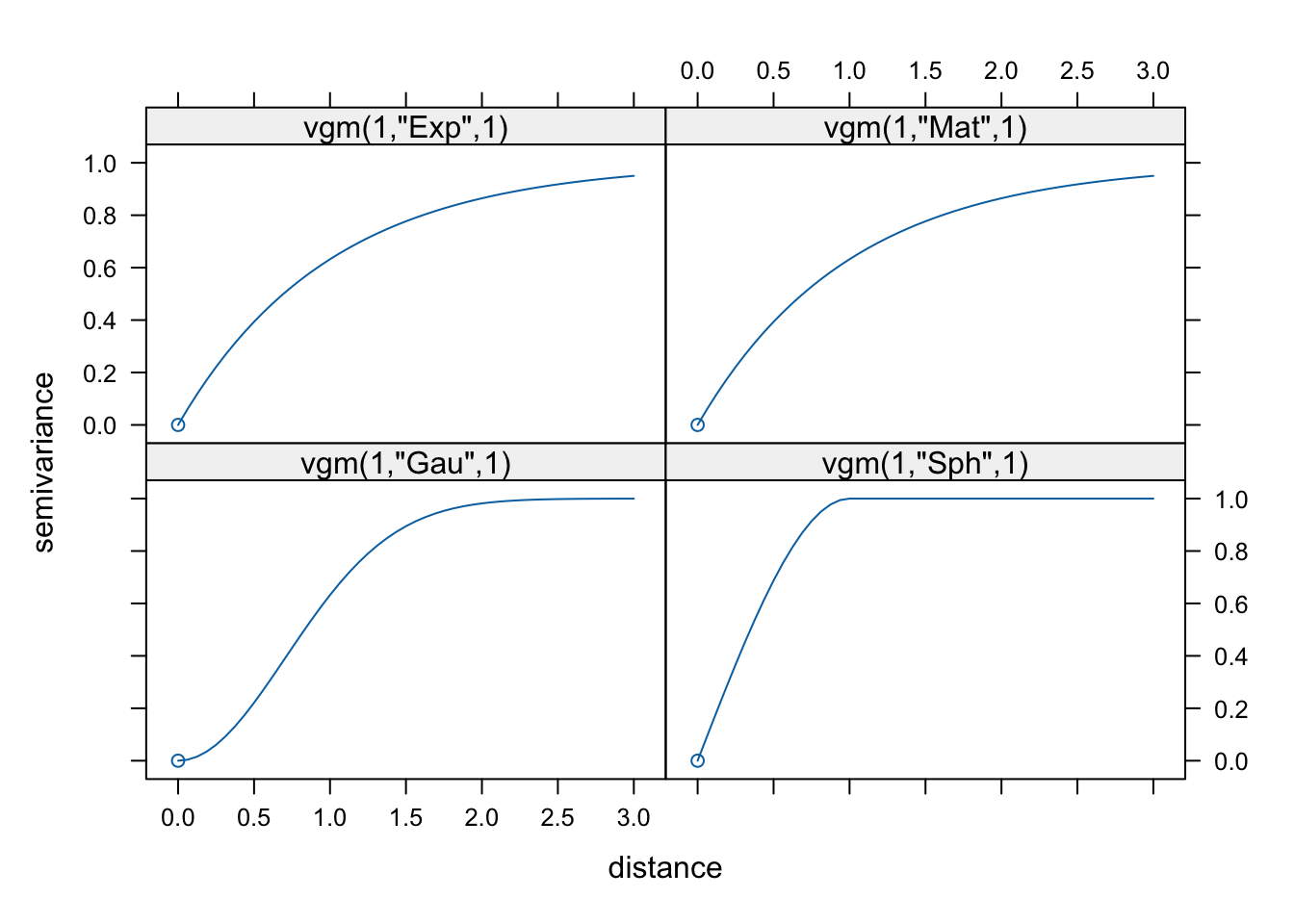 The spherical model above is very commonly used and has nice theoretical properties, using all three classic parameters of the variogram. We could, if we liked, fit some other models – an exponential model would fit well here too.