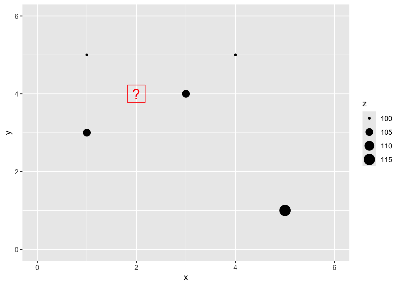Here is a small data set of five points. We have spatial coordinates (\(x\) and \(y\)) and some measured variable (\(z\)).